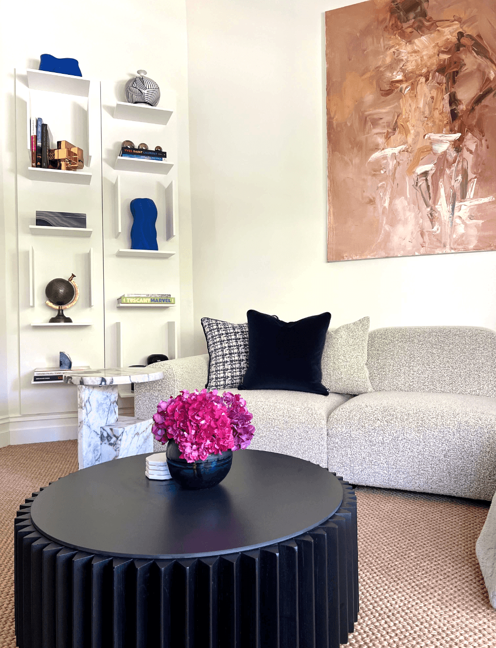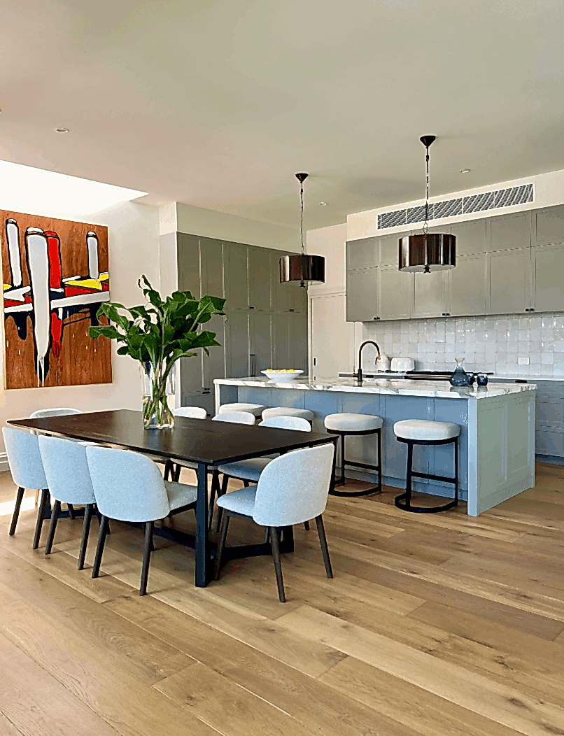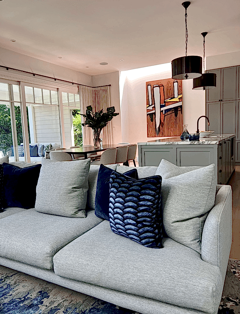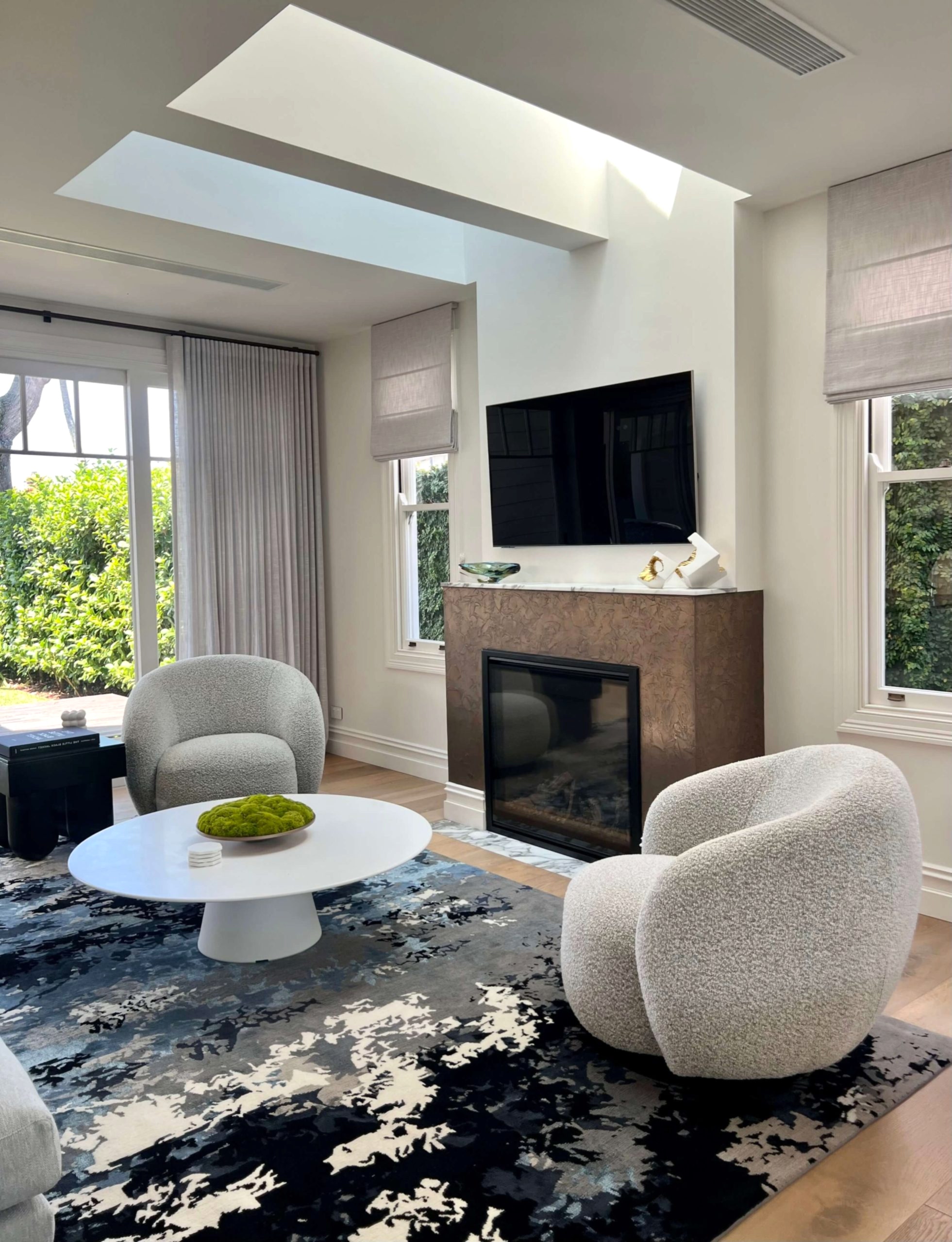 Randall Design Studio transformed this suburban home into a warm, modern sanctuary for a busy family of four. Wide-plank oak flooring and soft neutral walls are accented by bold blue hues and monochromatic ceramics. Textured wool rugs and custom-designed sofas ground the living spaces, creating a timeless yet dynamic aesthetic.