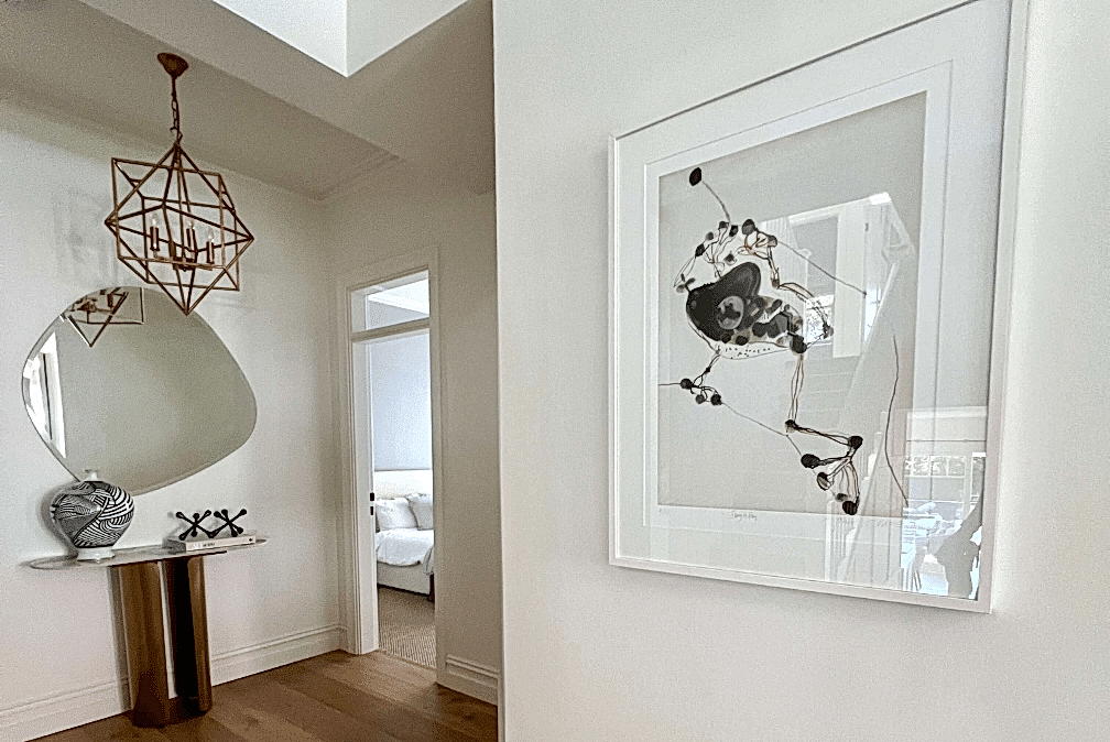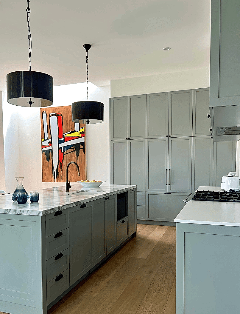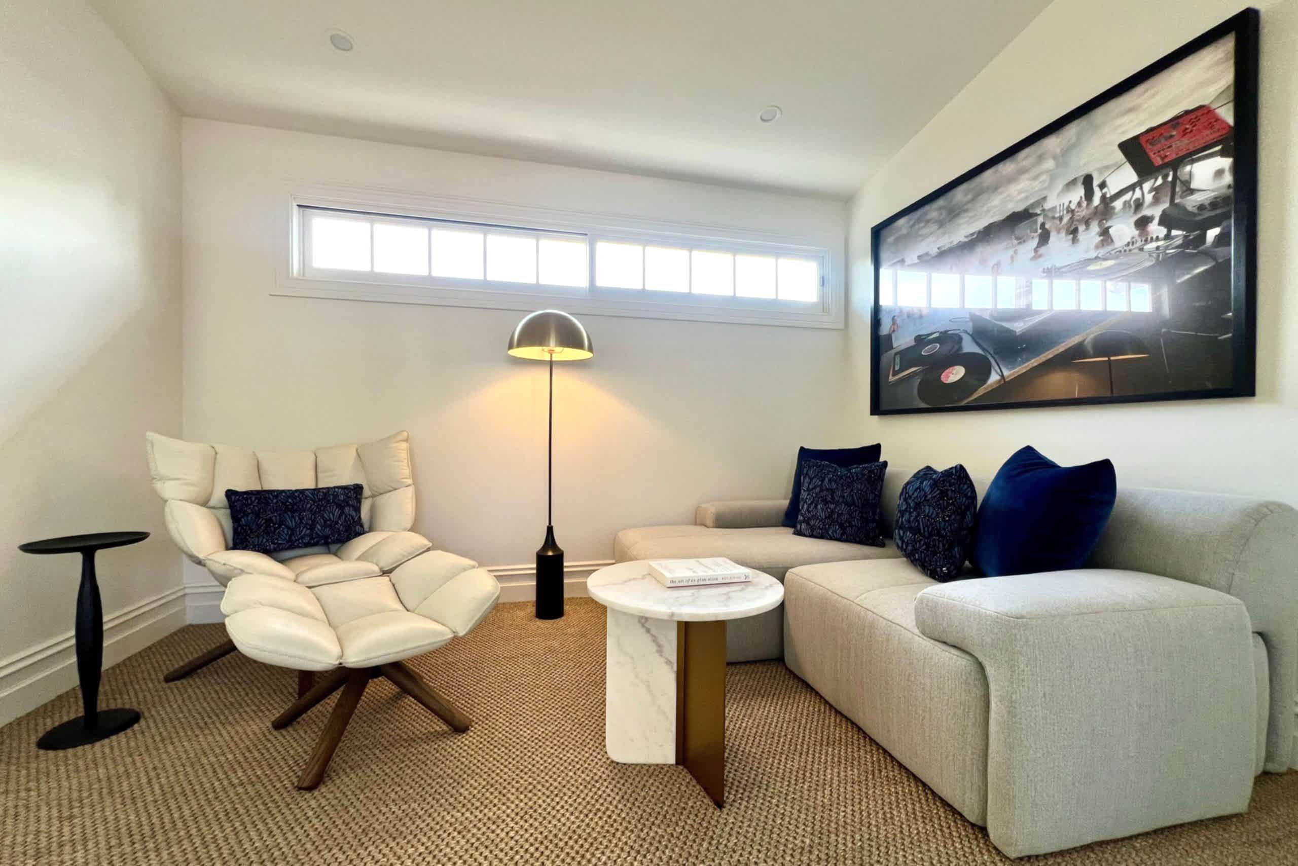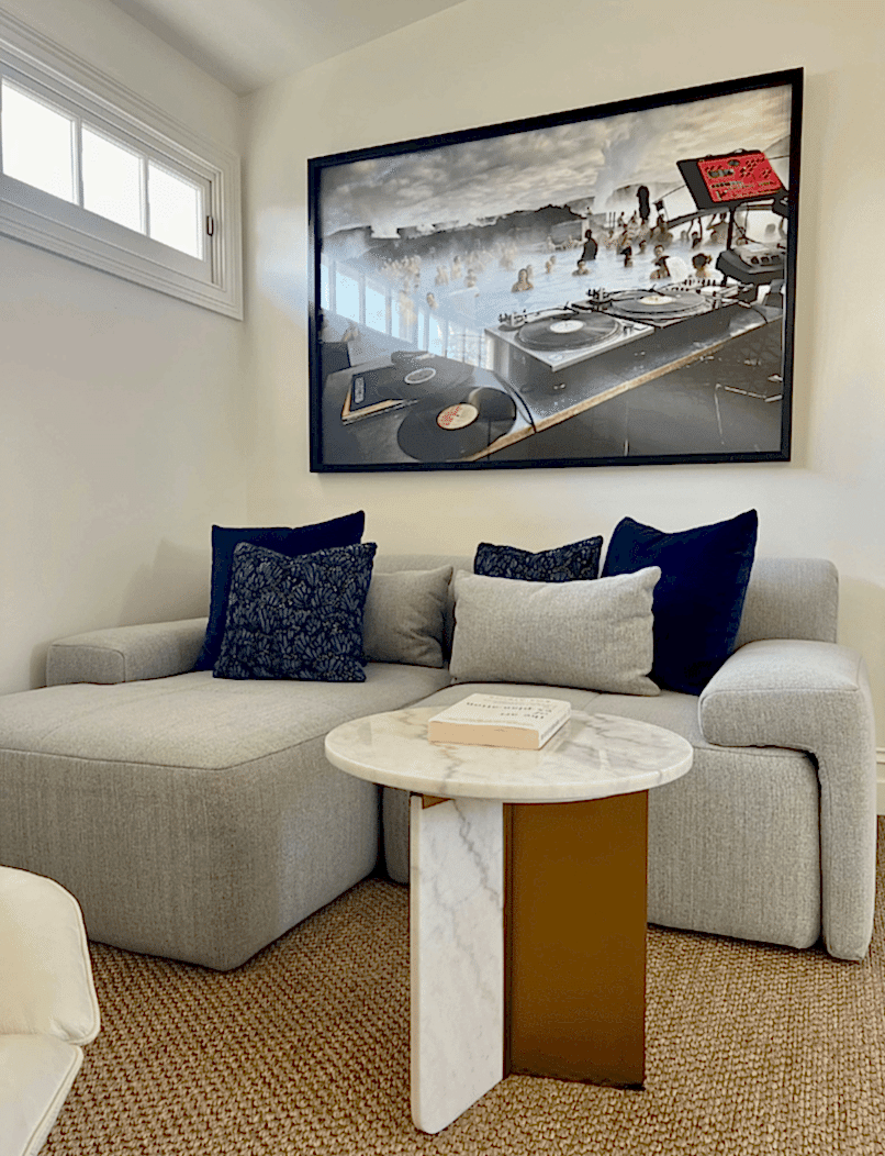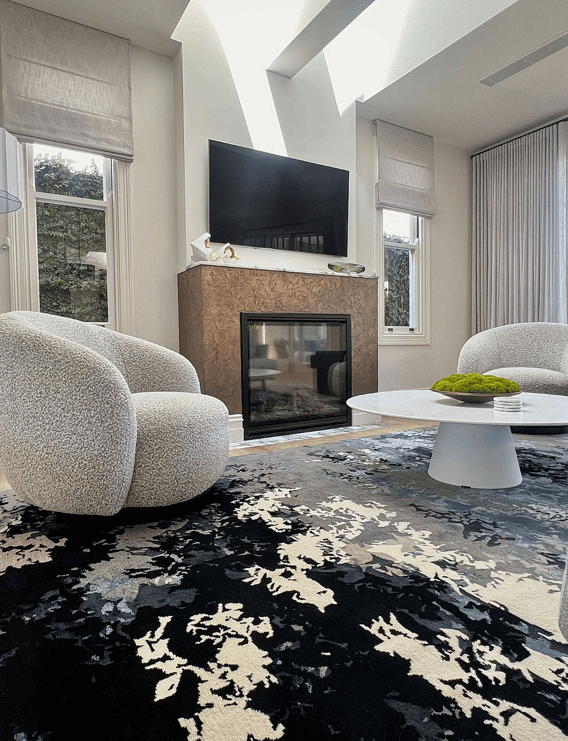 Randall Design Studio transformed this suburban home into a warm, modern sanctuary for a busy family of four. Wide-plank oak flooring and soft neutral walls are accented by bold blue hues and monochromatic ceramics. Textured wool rugs and custom-designed sofas ground the living spaces, creating a timeless yet dynamic aesthetic.