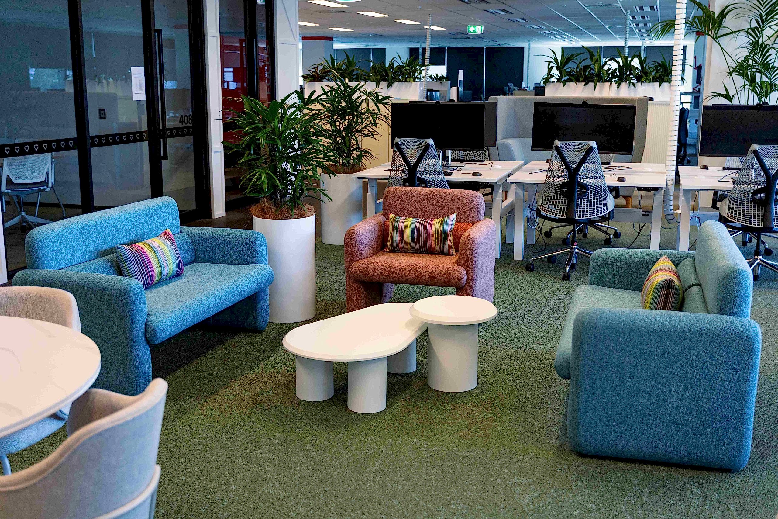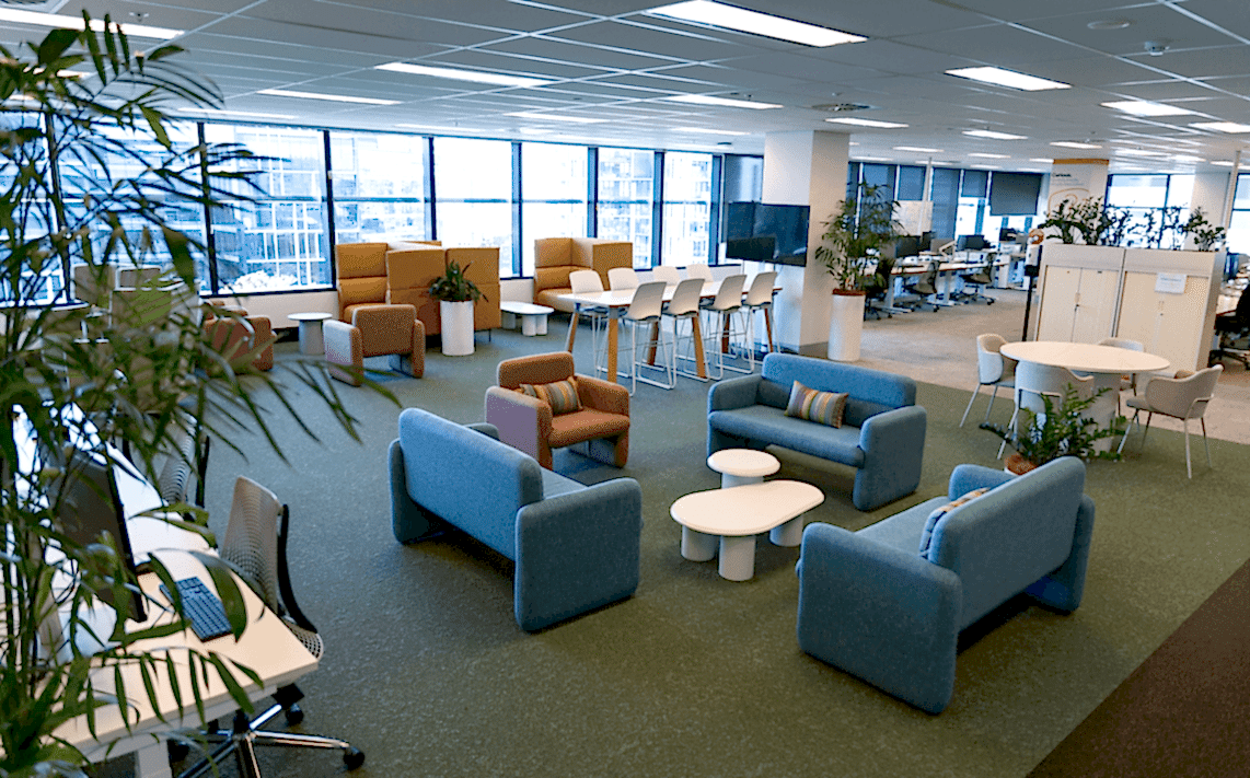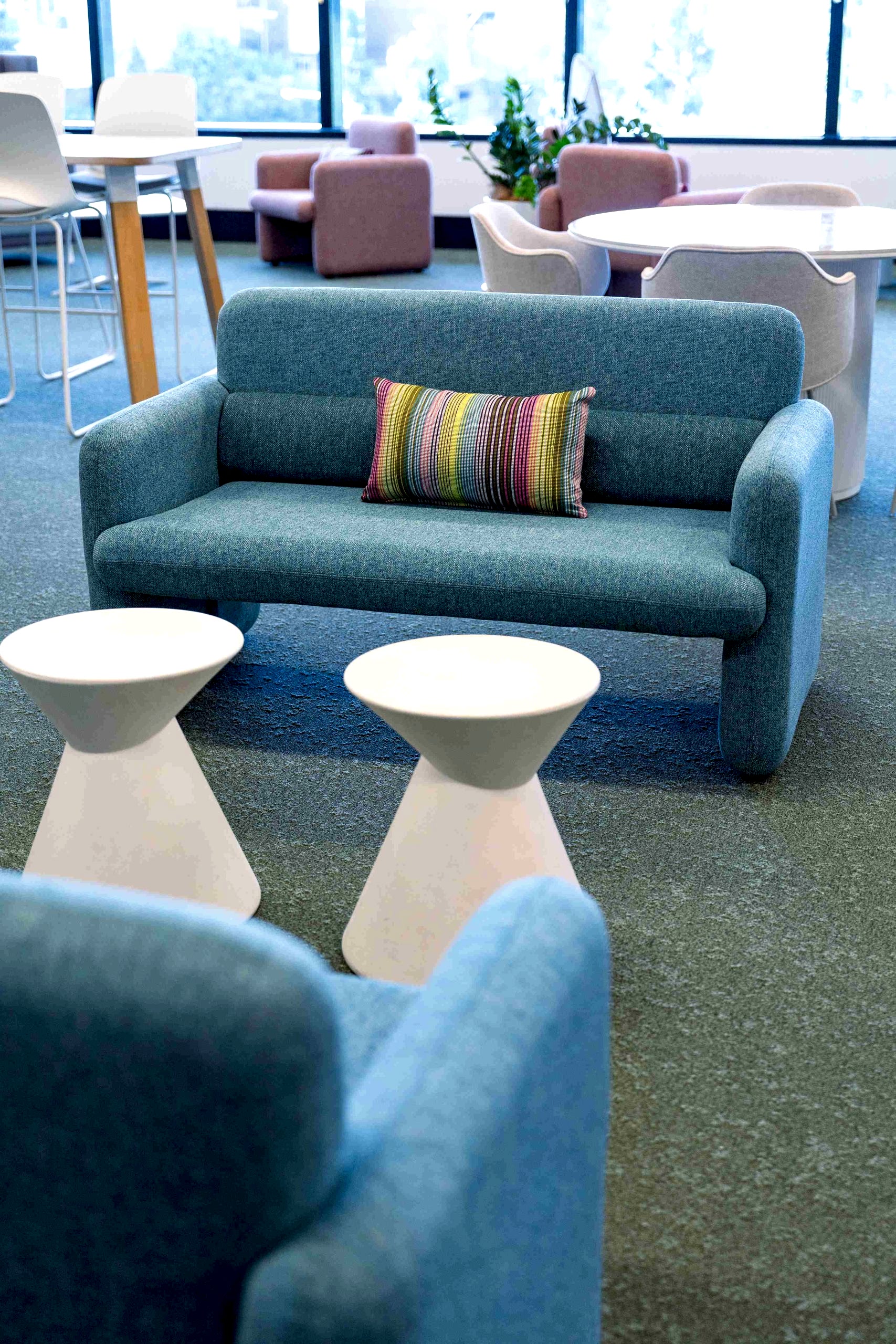 This corporate bank’s collaboration hub was redesigned to enhance teamwork, productivity, and flexibility. Smart spatial planning optimises breakout zones, quiet areas, and meeting spaces, balancing connection with focus. Durable fabrics and refined furniture ensure longevity while maintaining a professional yet inviting aesthetic. Breakout zones foster creativity, while private areas support concentration, creating a seamless blend of collaboration and solitude. The result is a dynamic workspace that elevates both engagement and efficiency.