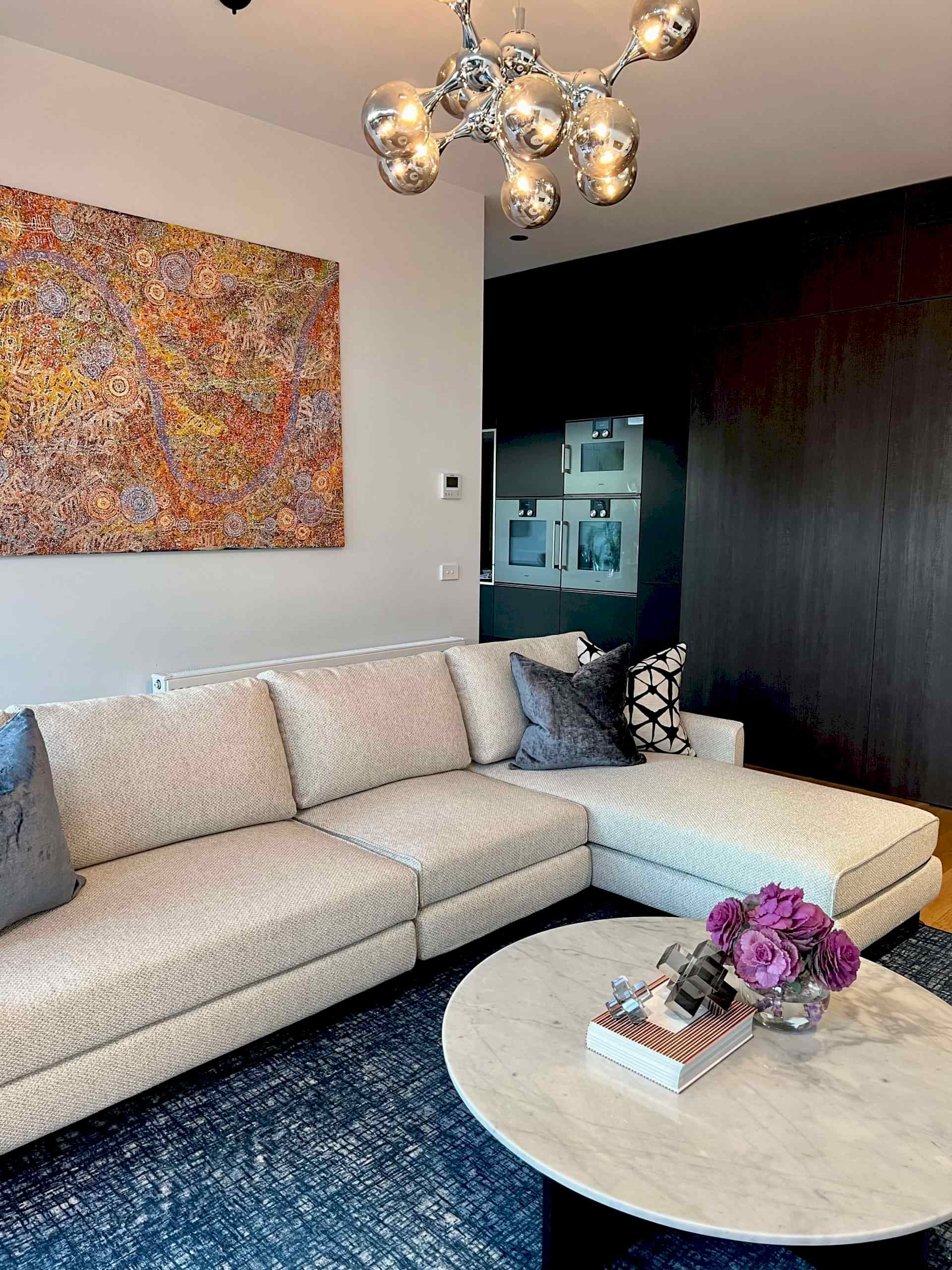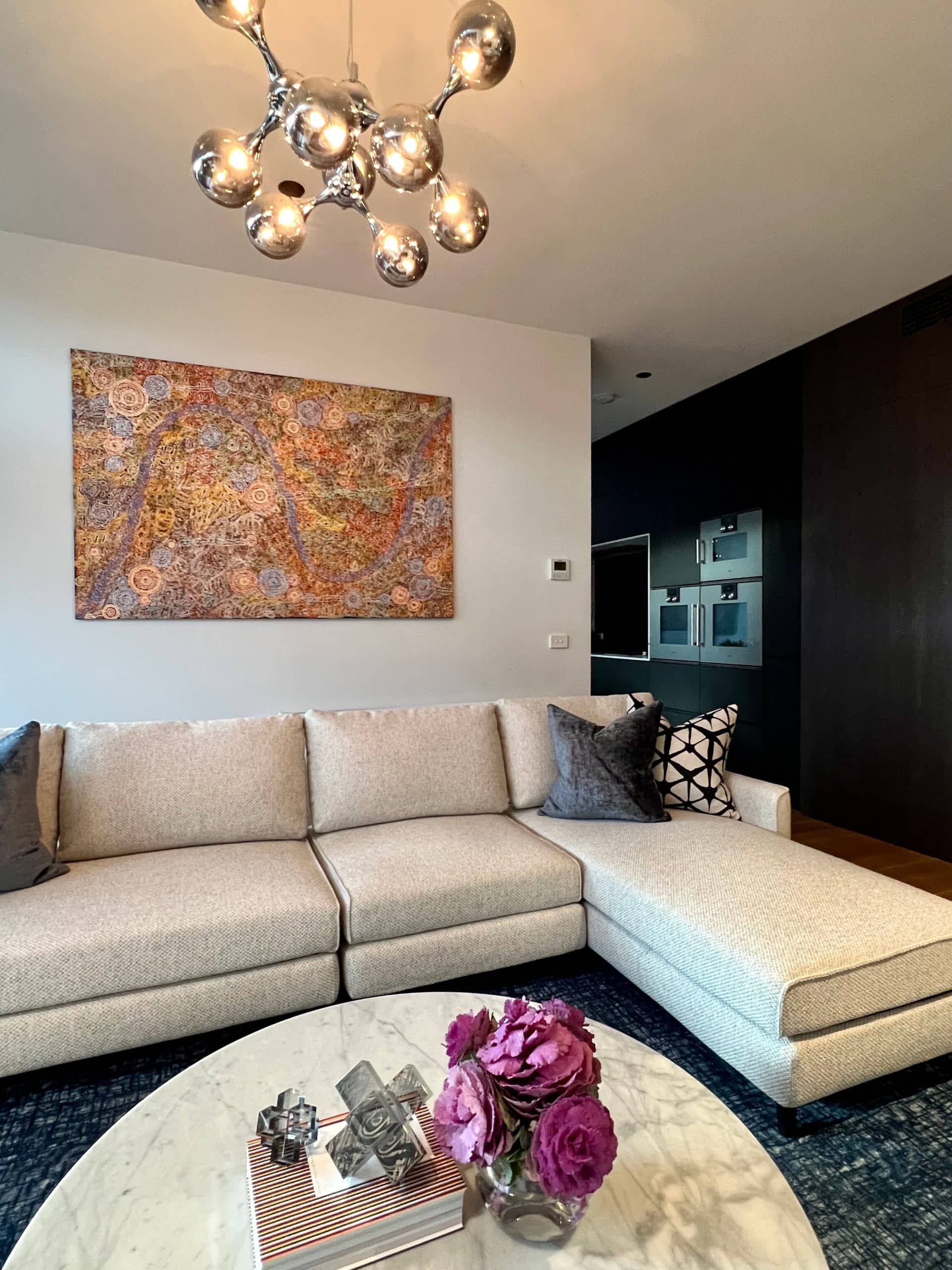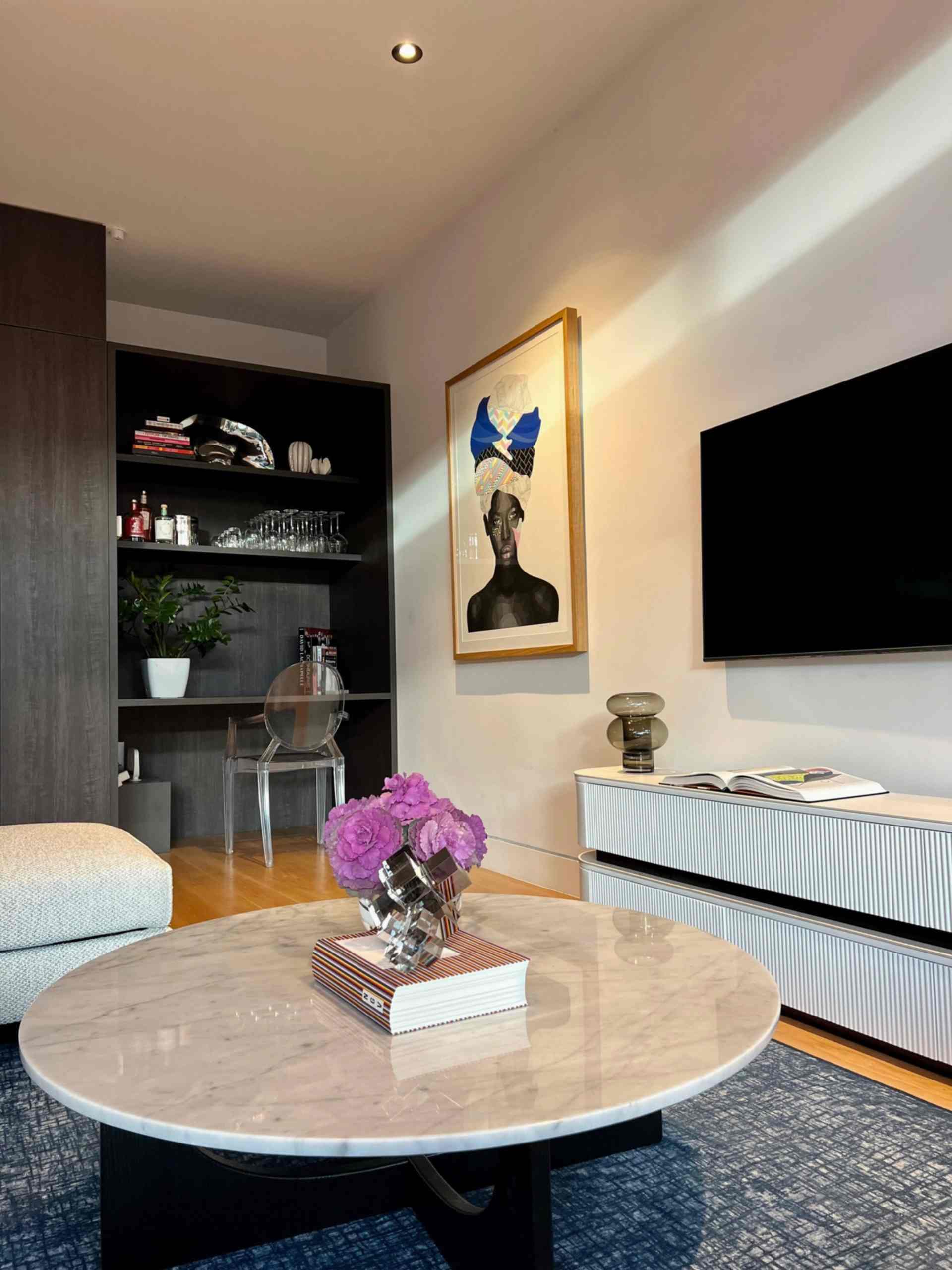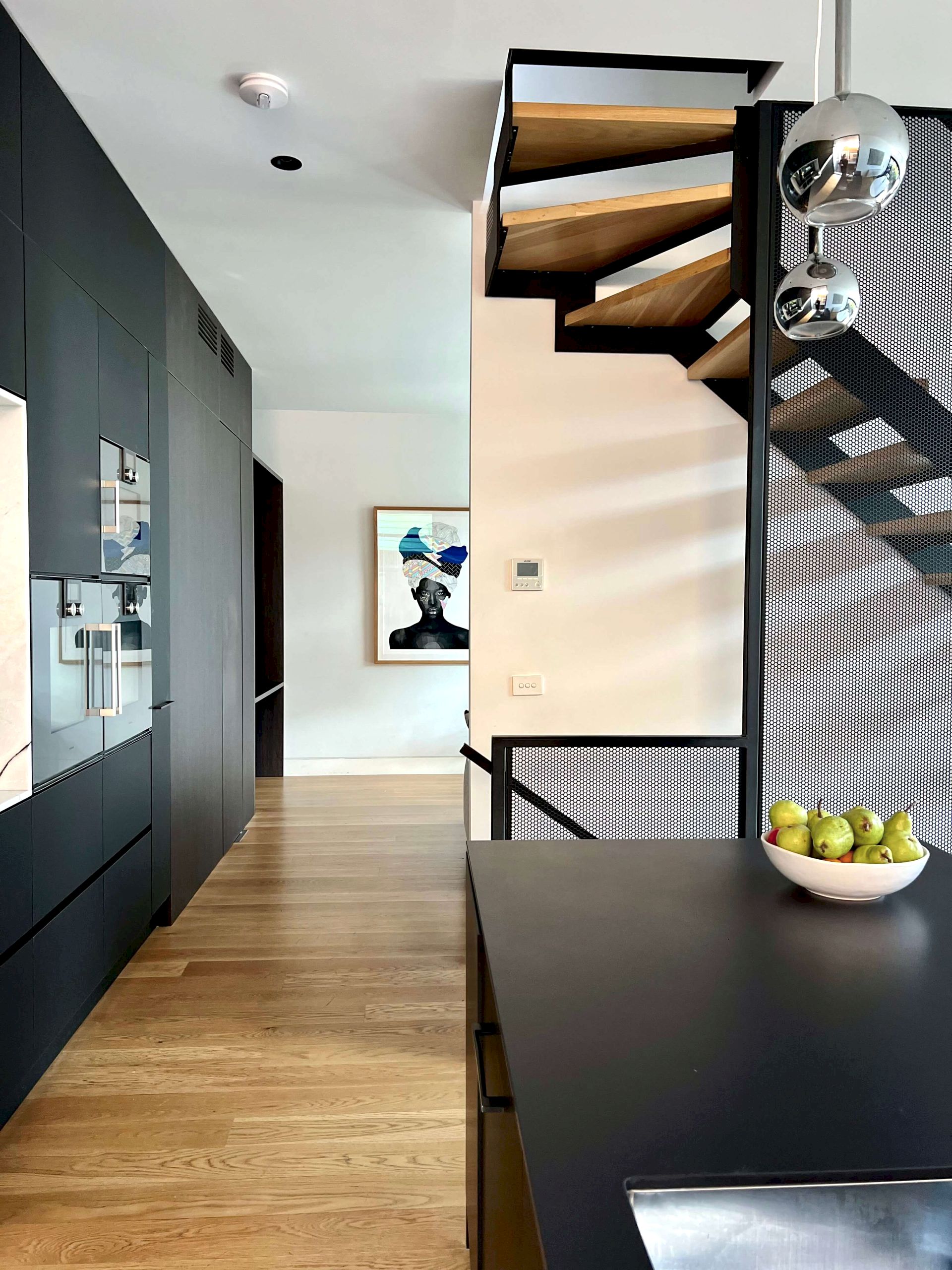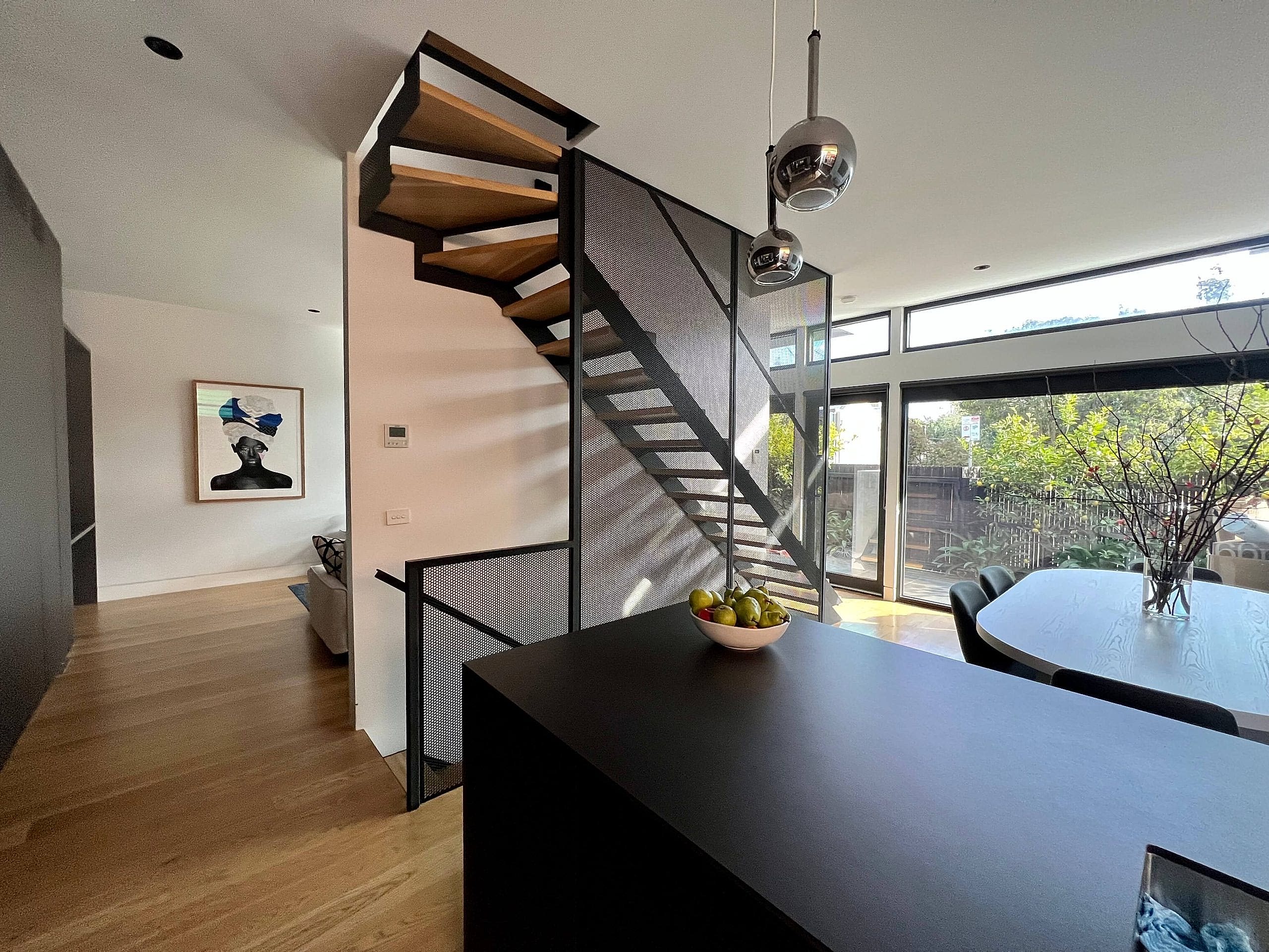 Randall Design Studio redefined this inner-city residence as a modern industrial haven. Exposed steel accents and matte black details contrast with warm timber flooring, while a bold stone kitchen island anchors the space. Neutral-toned soft furnishings and natural fabrics add warmth, balancing urban edge with inviting comfort for contemporary living.