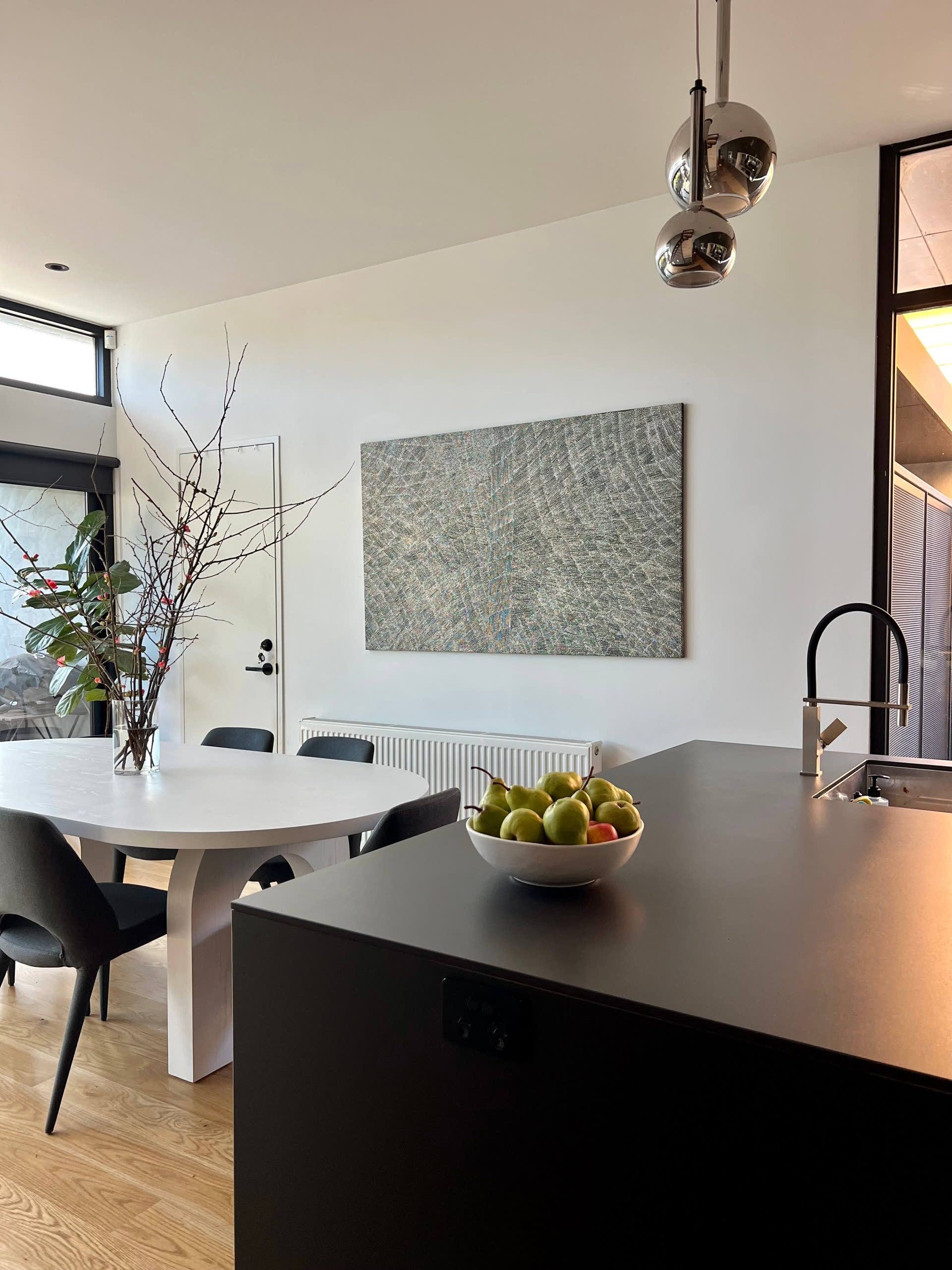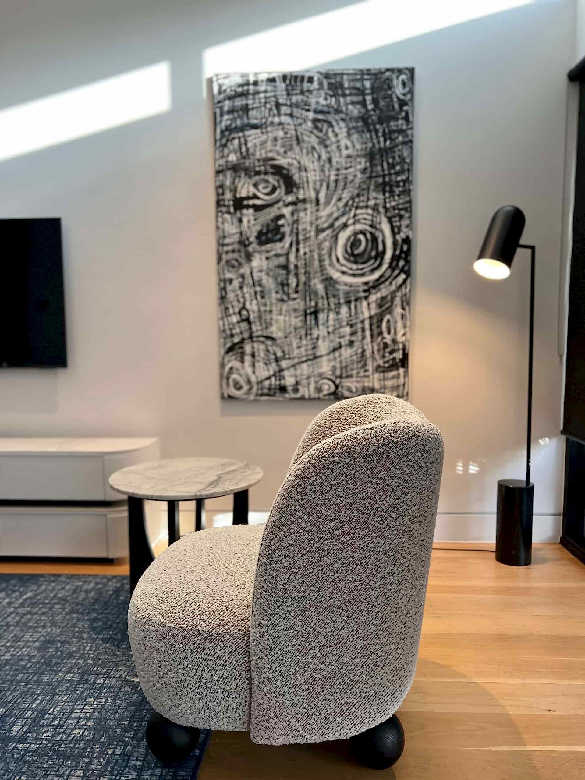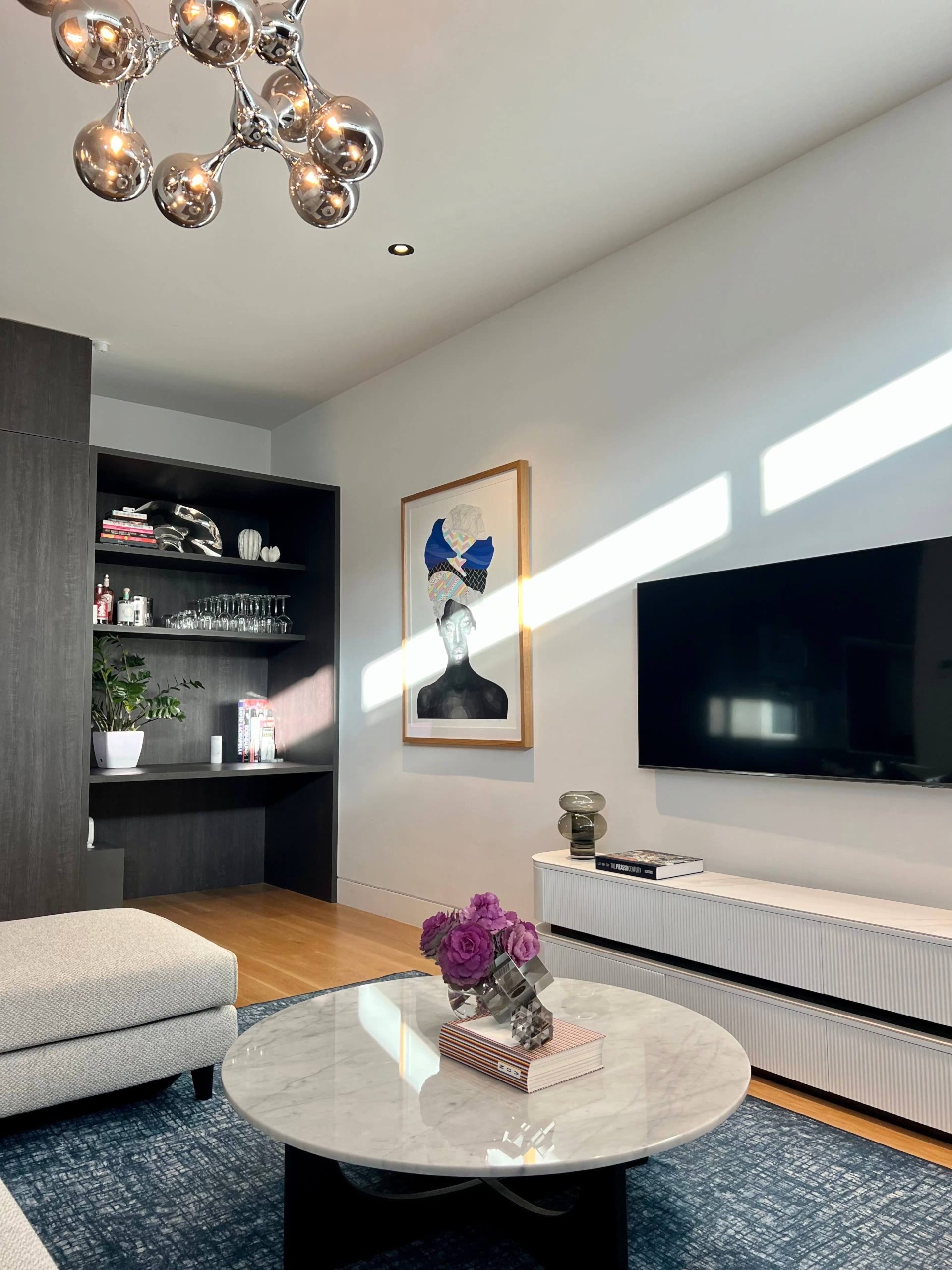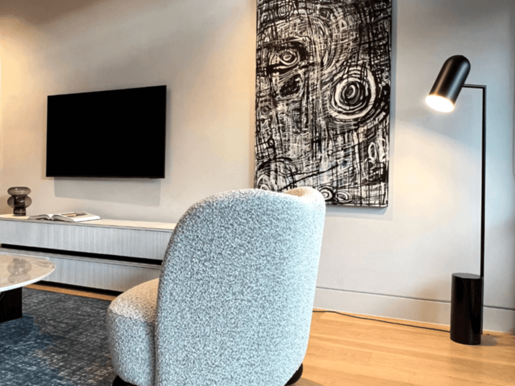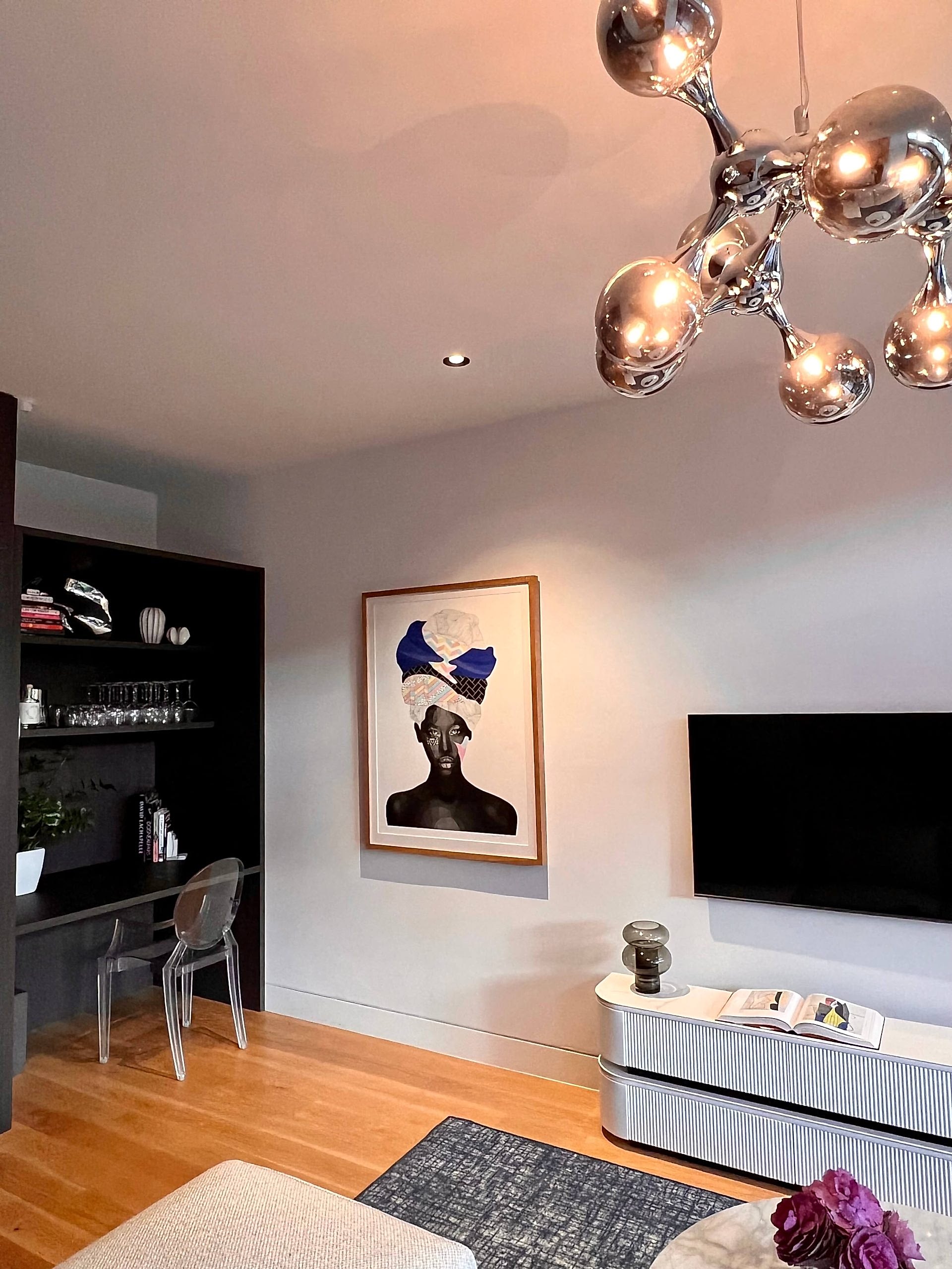 Randall Design Studio redefined this inner-city residence as a modern industrial haven. Exposed steel accents and matte black details contrast with warm timber flooring, while a bold stone kitchen island anchors the space. Neutral-toned soft furnishings and natural fabrics add warmth, balancing urban edge with inviting comfort for contemporary living.